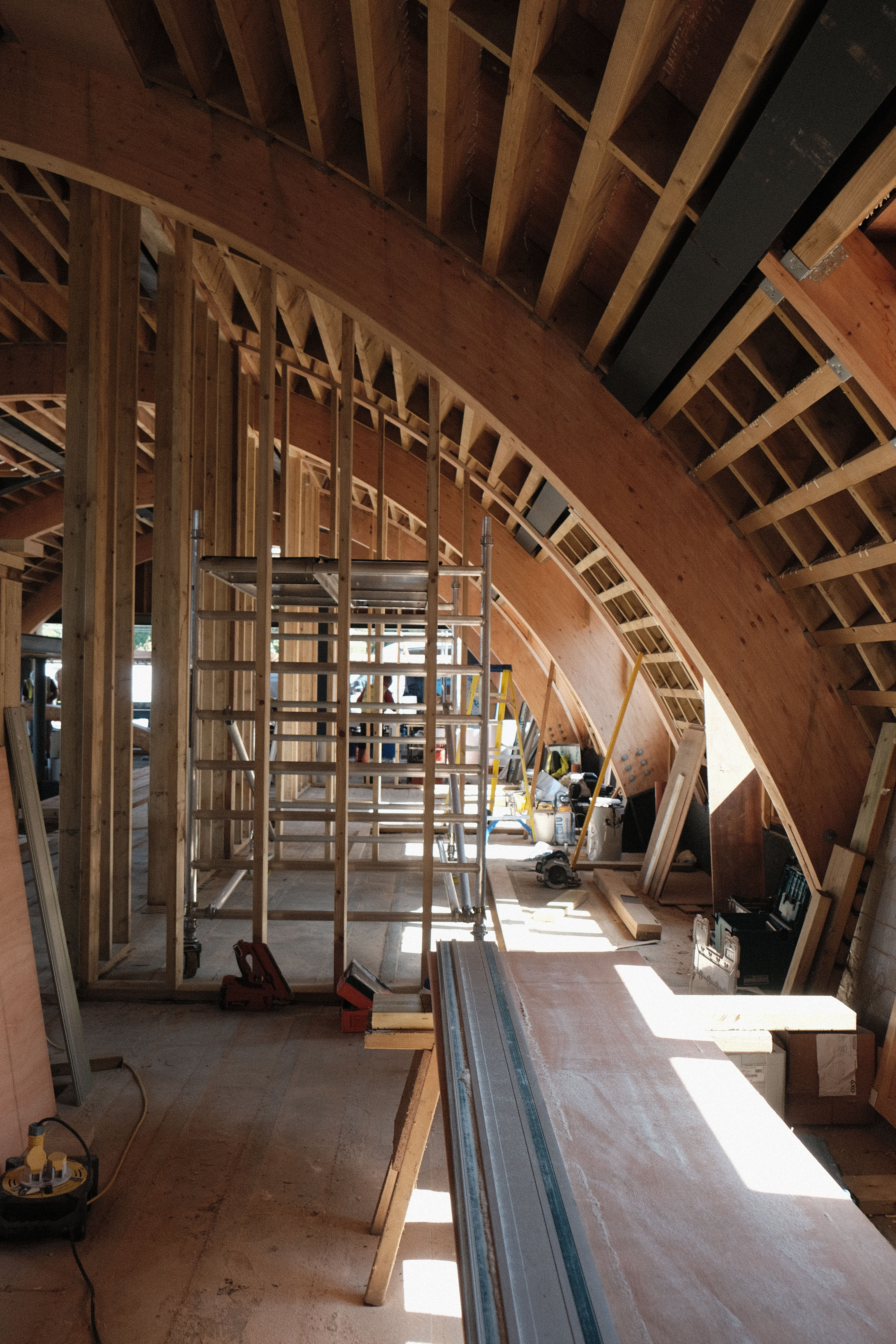 The main structure is supported by locally manufactured curved glulam beams which allow for an open plan layout and for the full height of the structure to be expressed internally, with soaring curved ceilings. Two mezzanines will be located above the sunken areas, with the sunken living room expanding into a sunken patio. Highly insulated external envelope and high-performance tripple glazing will ensure a comfortable enviroment all year round. Renewable energy sources provide hot water and space heating requirements: two air-source heat pumps + PV panels located elsewhere on site.